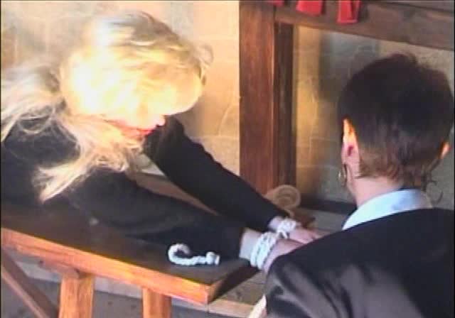 Bomb shell blond with massive breasts, tan, long sexy legs gets bound, crotch roped and made to cum!
